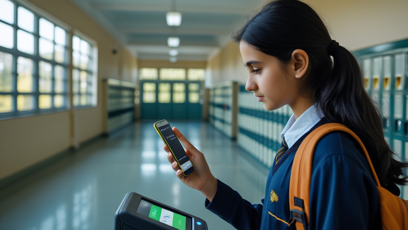 Un élève touche son téléphone à la grille de l'école, à la bibliothèque ou à la cantine. La carte d'élève numérique est délivrée par l'école ou l'inspection — valable pour l'année scolaire.